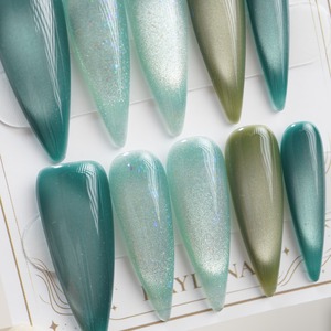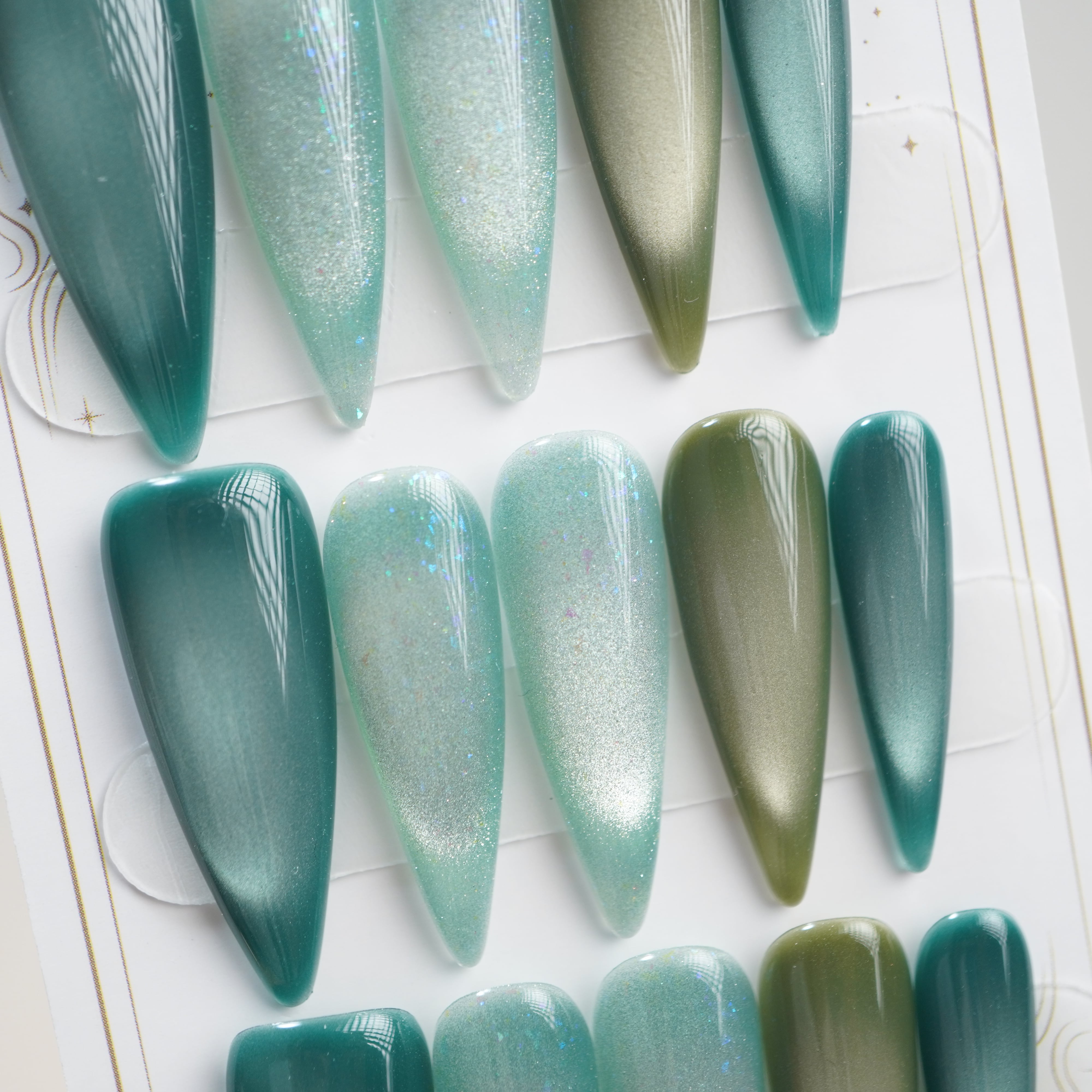 【#706】繰り返し使える【プレミアム】ネイルチップ/15枚セット/グリーン マグネット/スーパーロング ポイント/XX267