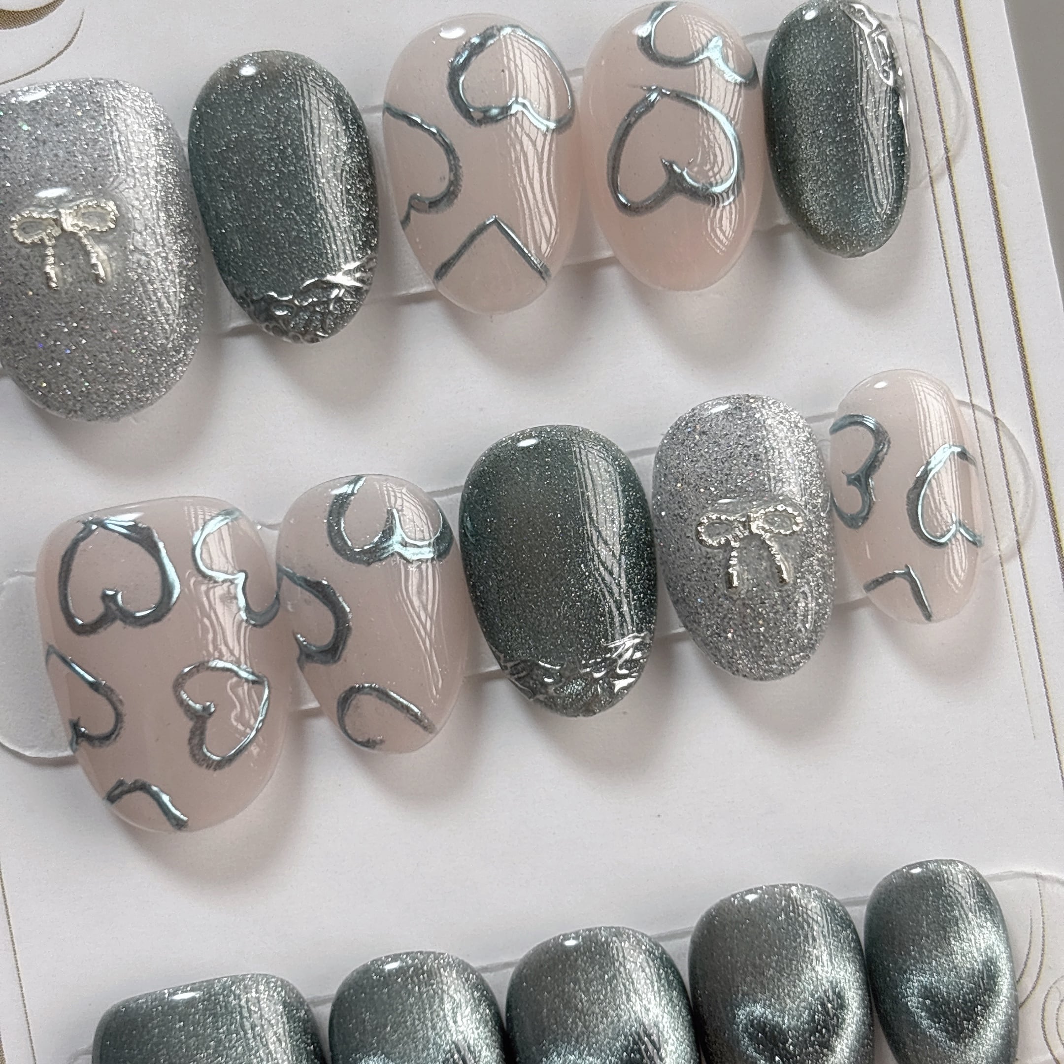 【#719】繰り返し使える【プレミアム】ネイルチップ15枚セット/グリーン ハートマグ/ショート アーモンド/XY279
