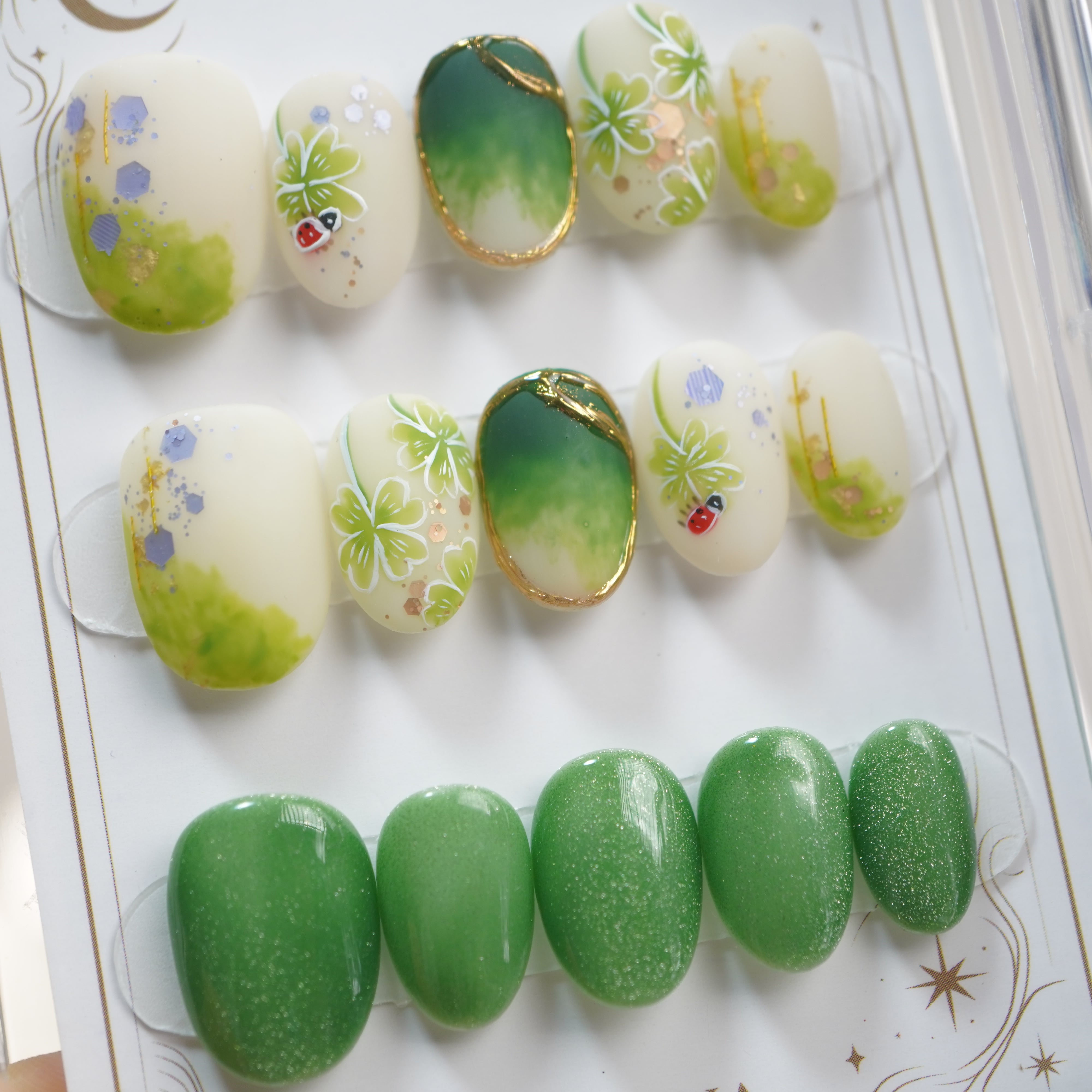 【#クローバー】アクセサリー&ネイルチップ15枚セット/グリーン クローバー/ショート アーモンド/XY