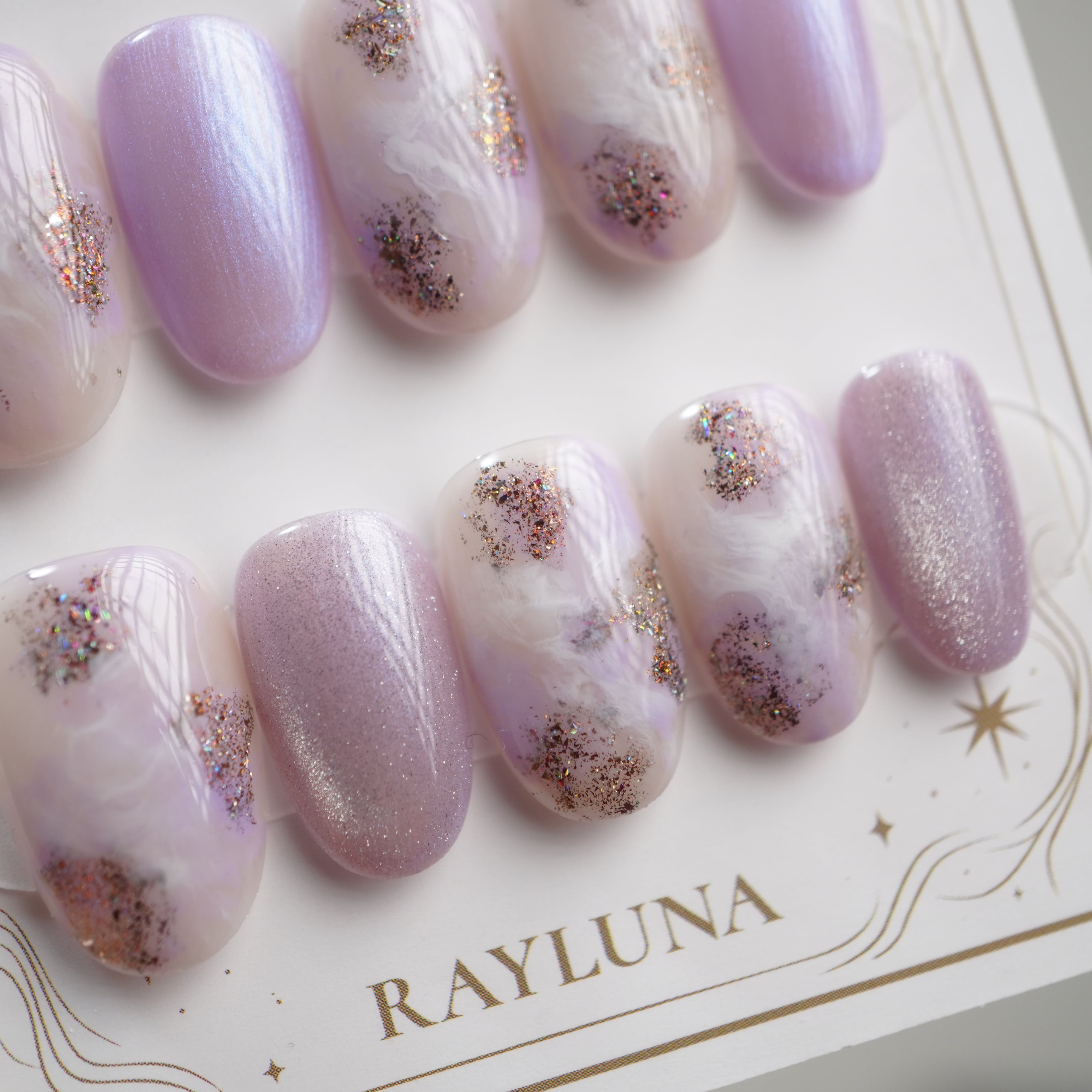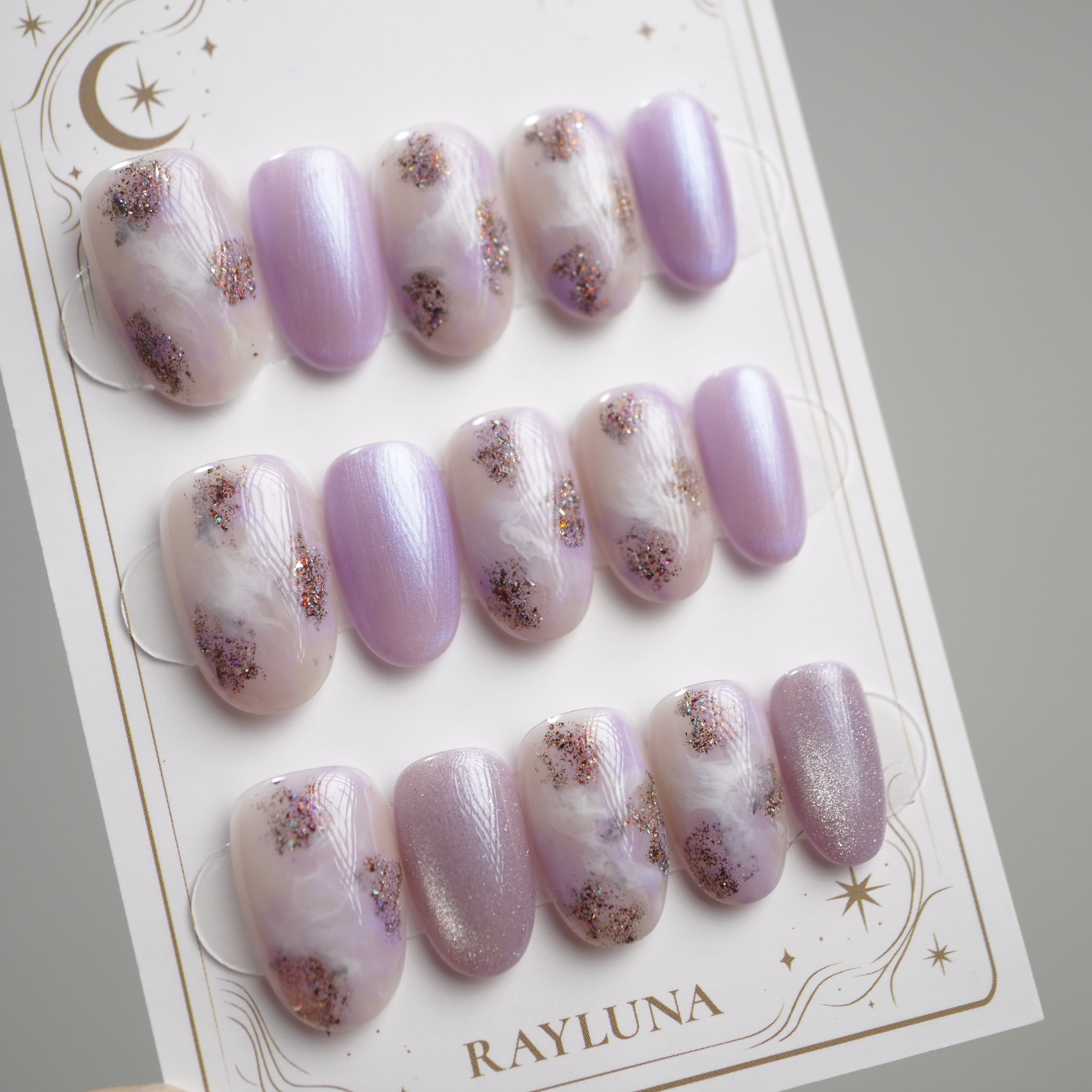 【#735】繰り返し使える【プレミアム】ネイルチップ15枚セット/パープル ホワイト/ミディアム オーバル/XY295