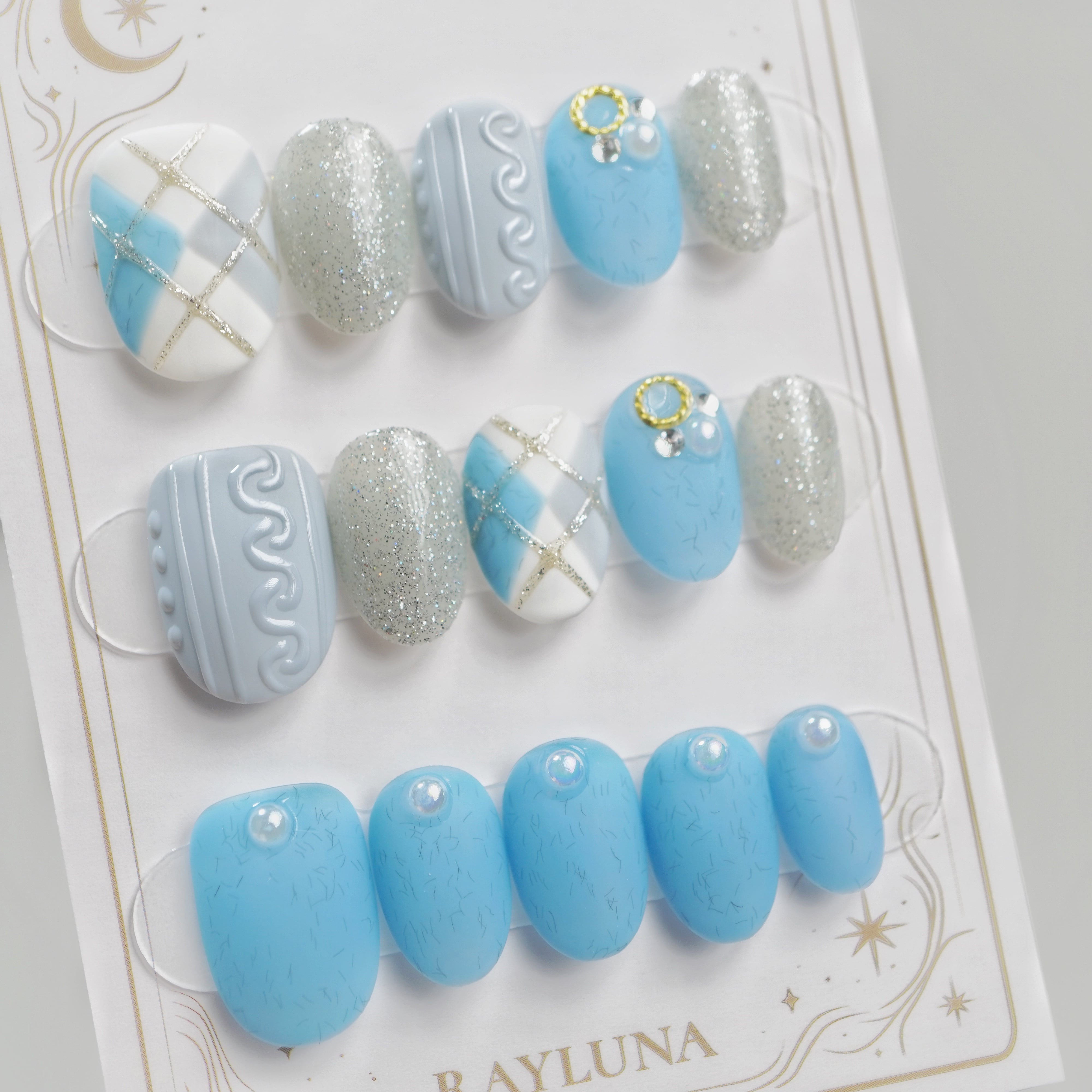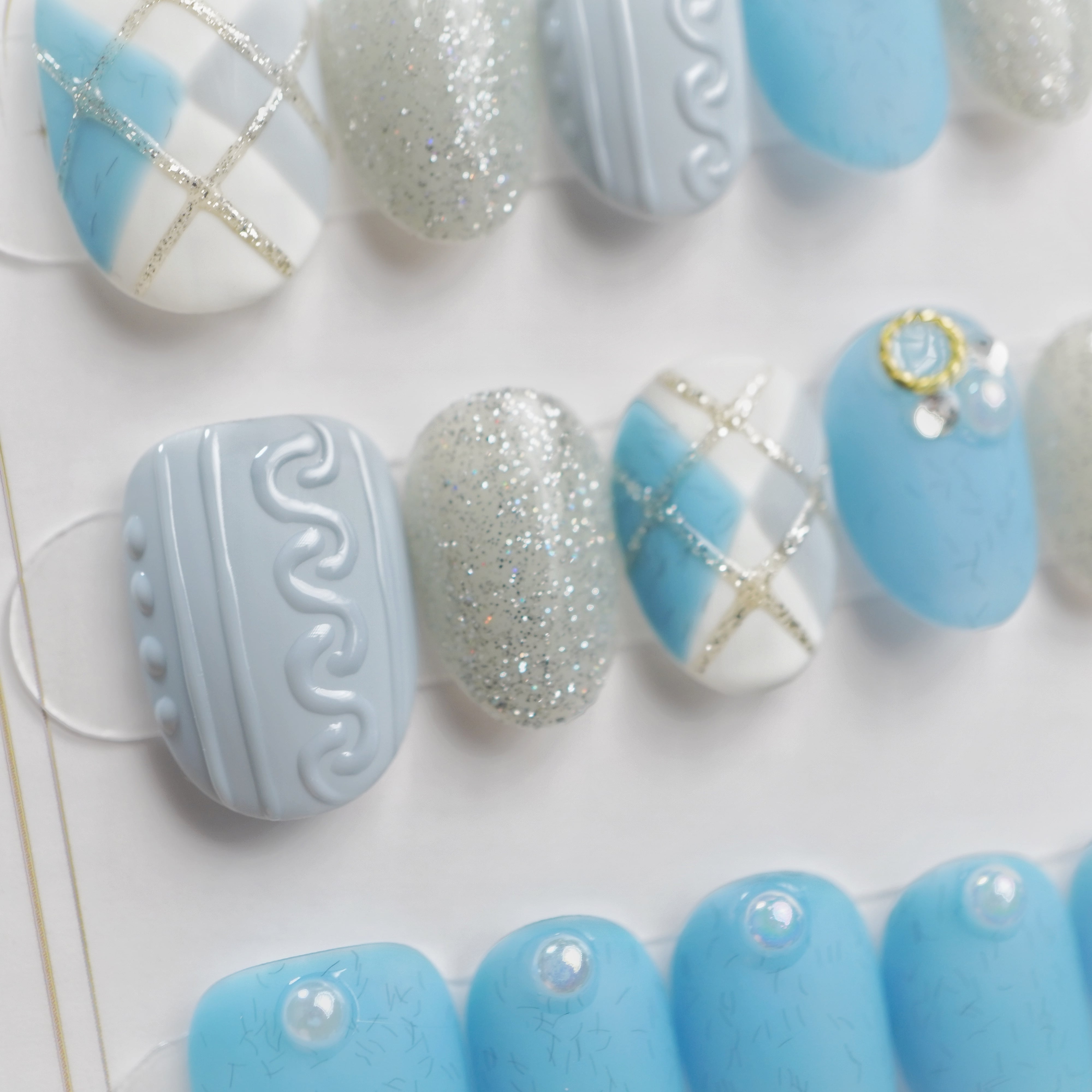 【#775】繰り返し使える【プレミアム】ネイルチップ15枚セット/ブルー ホワイト/ショート アーモンド/XY335