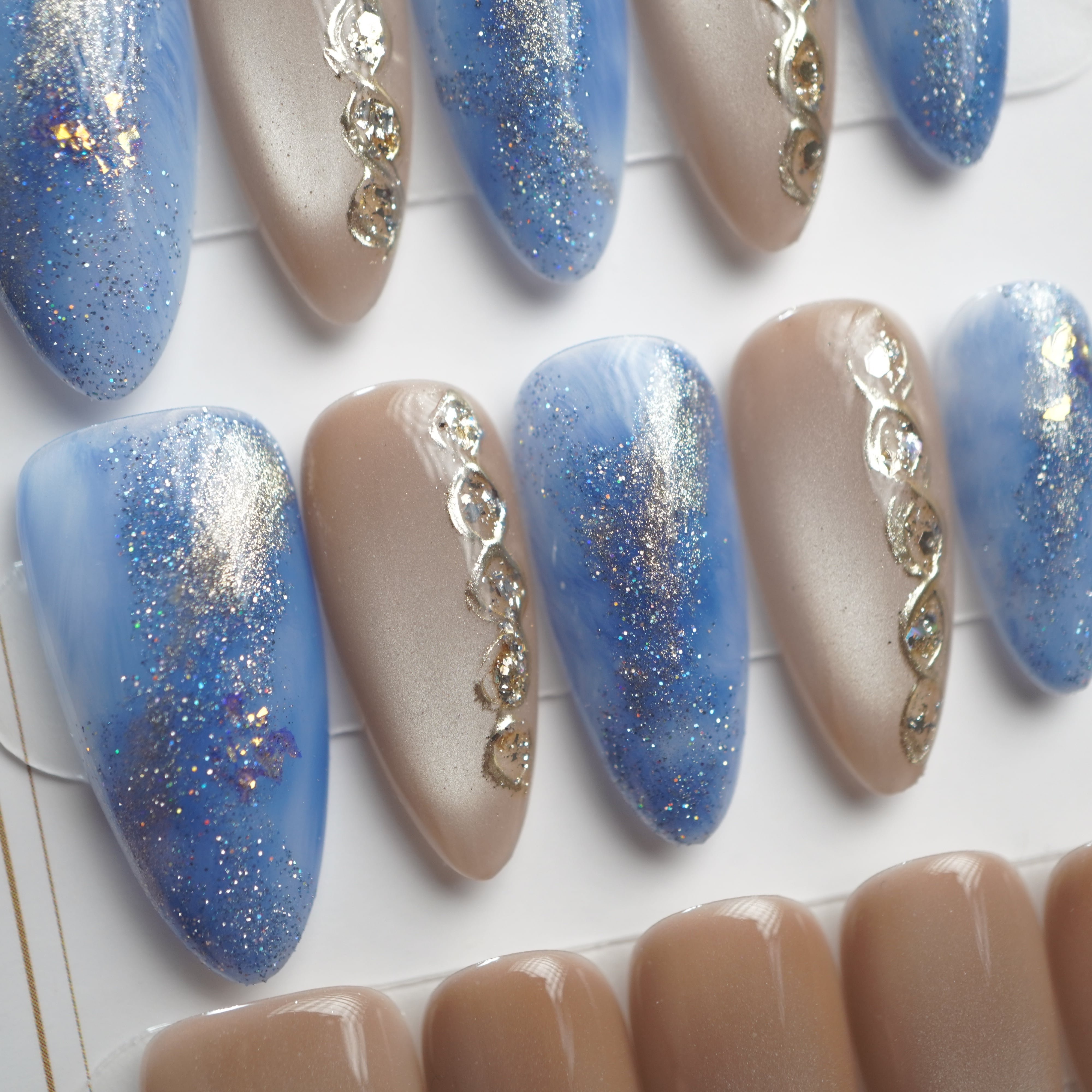 【#667】繰返し使える15枚セット【プレミアム】ネイルチップ/ブルー ベージュ/ロングアーモンド/XY227
