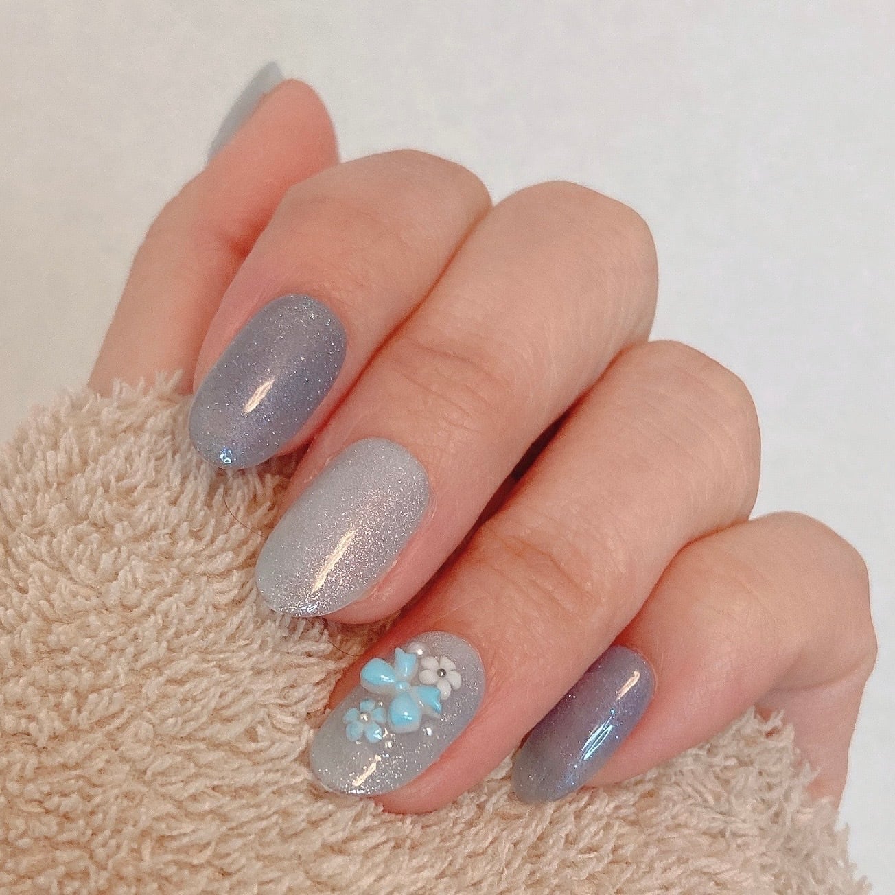 【#1013】指先シンデレラ/繰返し使える15枚セット【プレミアム】ネイルチップ/ミディアム オーバル/ブルー×微細ラメ×小花/XY