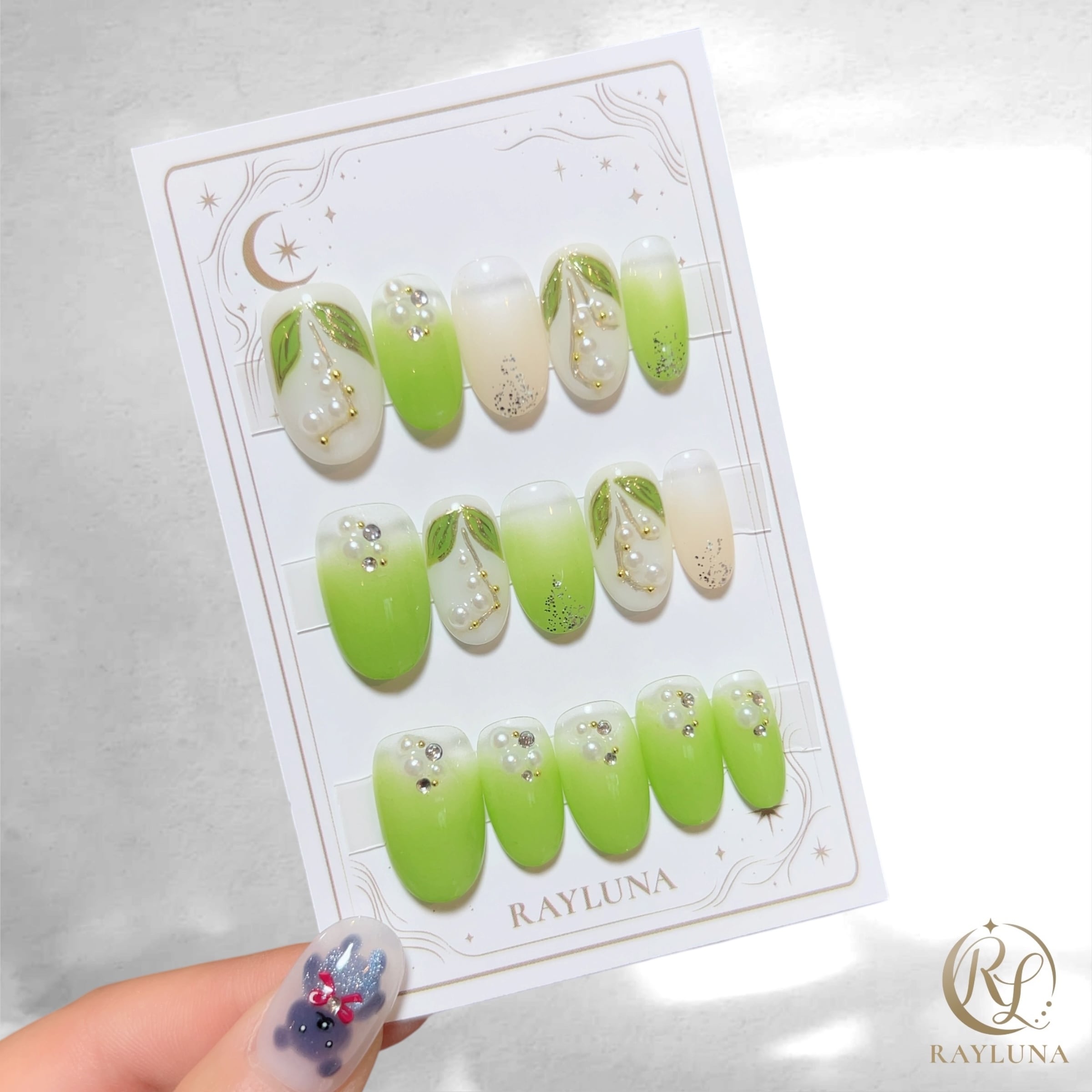 5月のちっぴー新作【#1104】新緑のすずらん/レイルナオリジナル 15枚入り/繰返し使える【プレミアム】ネイルチップ/ミディアム オーバル/フレッシュグリーン×ホワイト×スズラン